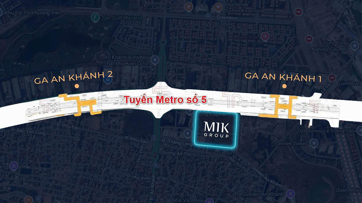Điểm khác biệt dễ nhận thấy của MIK Nam An Khánh là vị trí bám trực tiếp mặt đường Đại lộ Thăng Long – trục hướng tâm quan trọng nhất phía Tây Hà Nội, đồng thời nằm ở khoảng giữa hai điểm ga Metro số 5 An Khánh 1 và An Khánh 2 (theo sơ đồ minh họa). Cách bố trí này giúp dự án vừa thuận tiện di chuyển bằng ô tô, vừa có lợi thế khi hệ thống metro đi vào khai thác